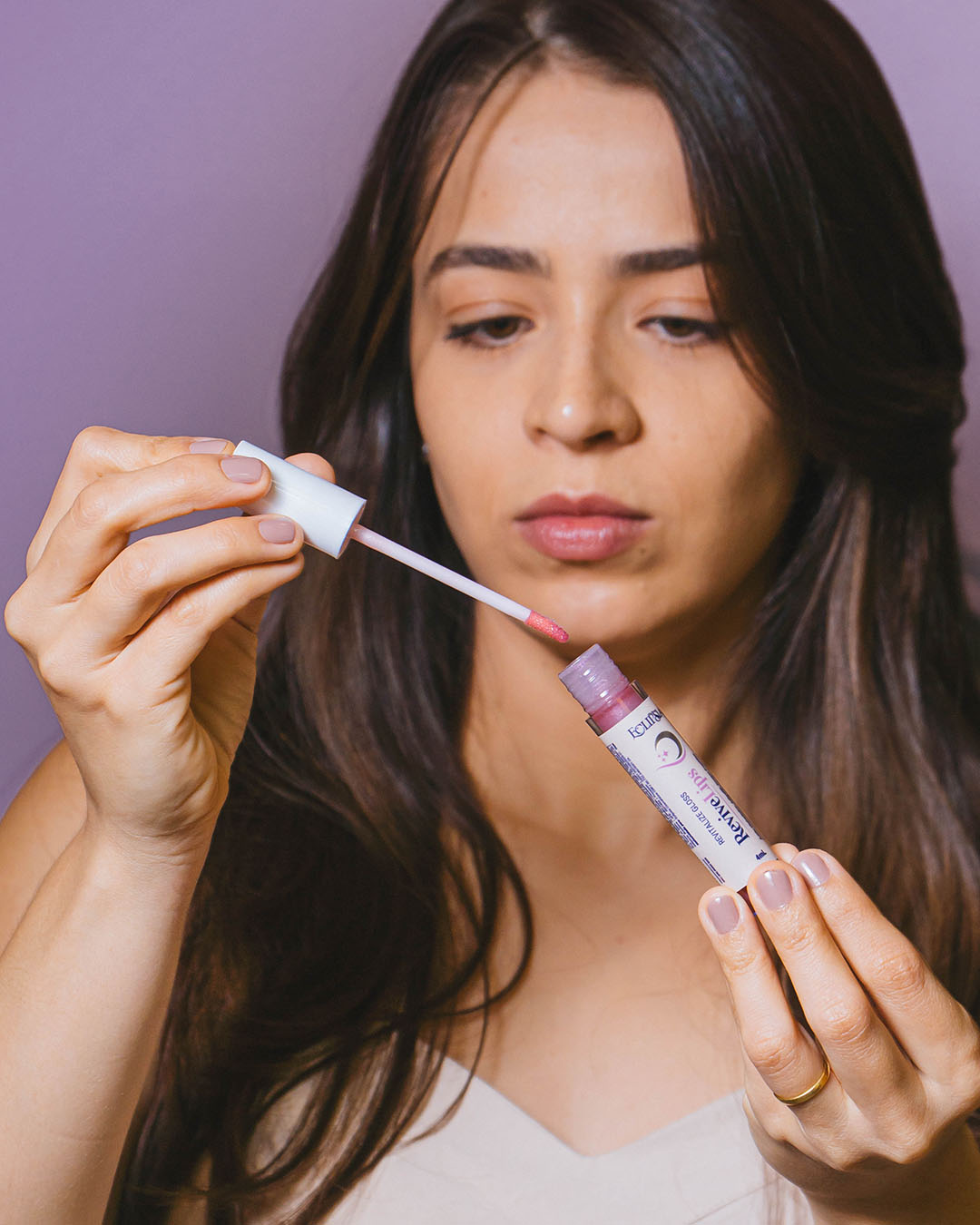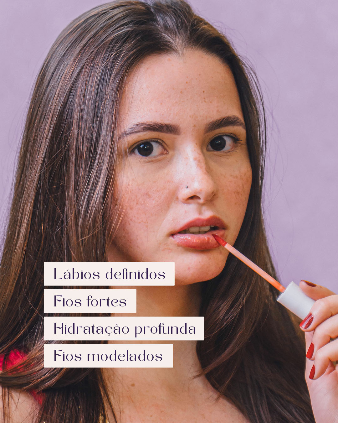 Os peptídeos estimulam a firmeza e melhoram a estrutura dos lábios, deixando o contorno mais definido e o aspecto mais cheio conforme o uso contínuo, não é só brilho.