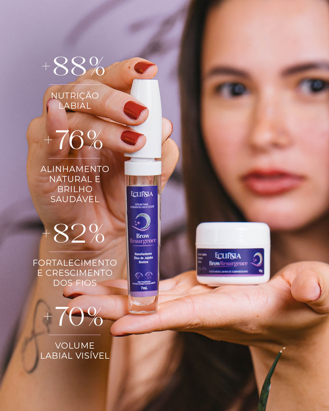 Para as sobrancelhas e cílios, o Sérum Home Care Brow Resurgence estimula o crescimento com Nanofactores de regeneração, Biotina, Vitamina E, Jojoba e Pantenol. Fortalece a raiz, melhora a densidade, reduz queda e acelera o surgimento de fios novos.