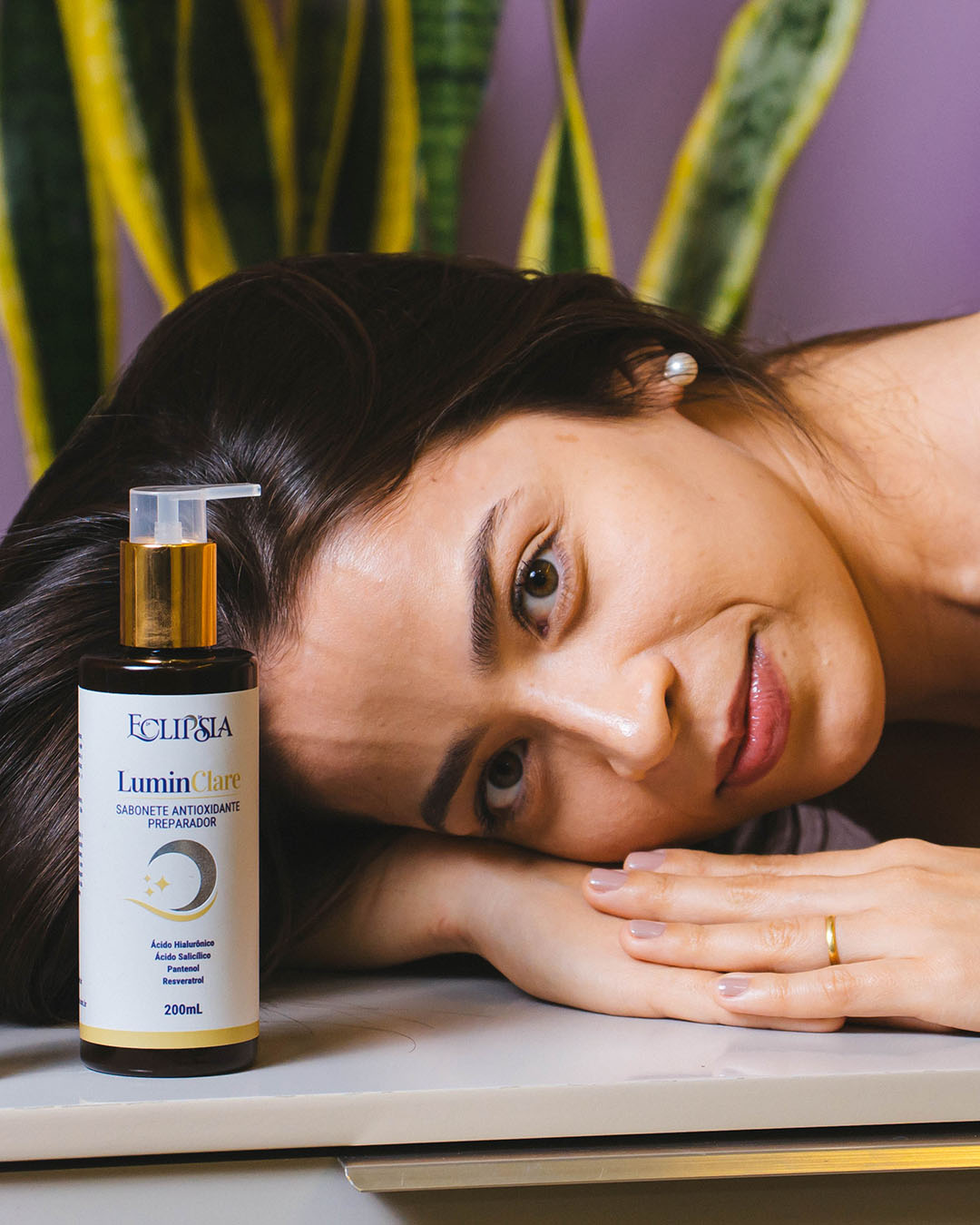 O ritual começa com o Sabonete Antioxidante Preparador LuminClare, que remove impurezas, controla oleosidade e neutraliza radicais livres, preparando a pele para receber os próximos passos.