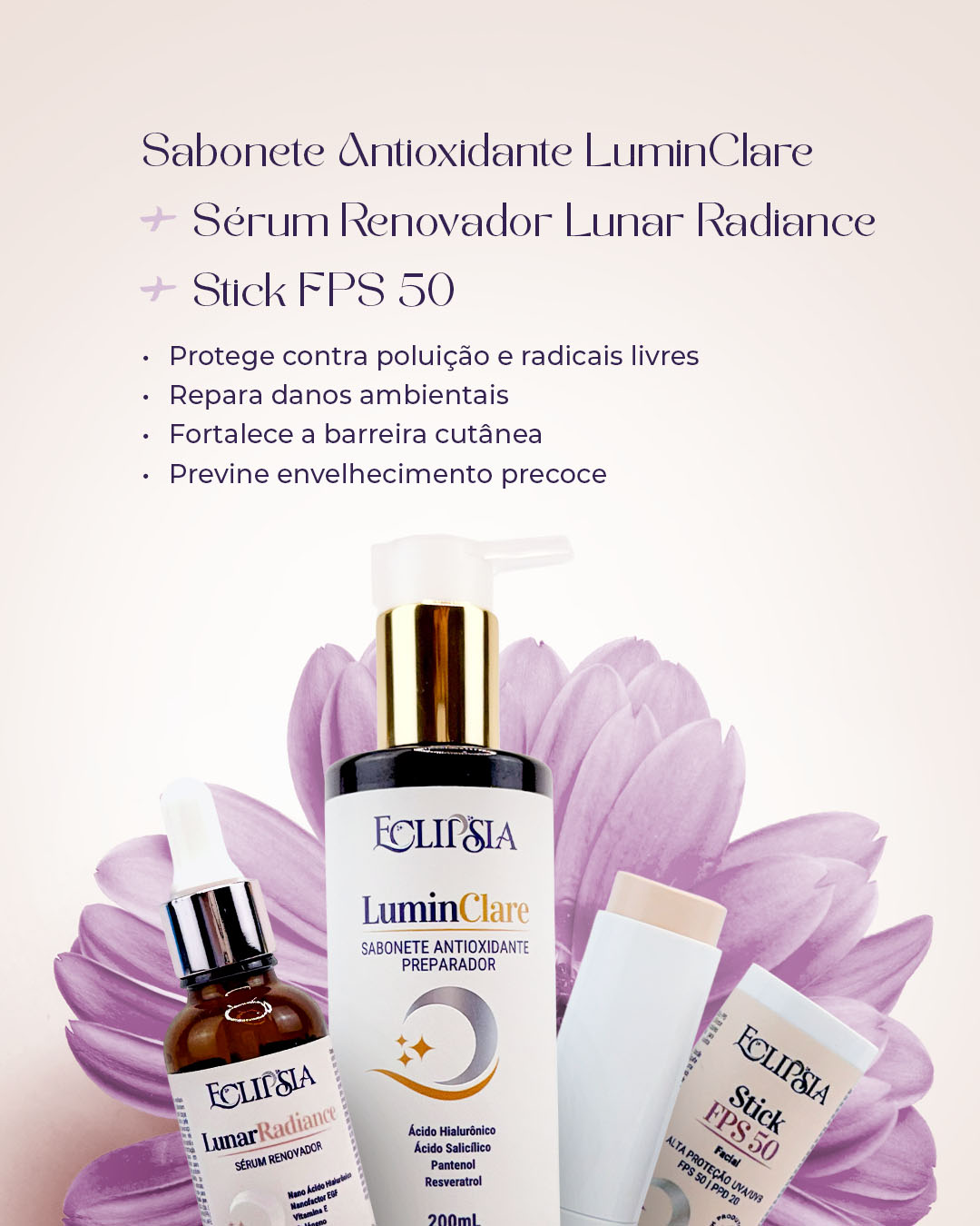 Sim, ele age diretamente contra radicais livres, partículas de poluição e estresse ambiental. O sabonete antioxidante acalma e purifica, o sérum reforça colágeno e barreira cutânea e o stick garante defesa diária contra UVA/UVB e luz visível.