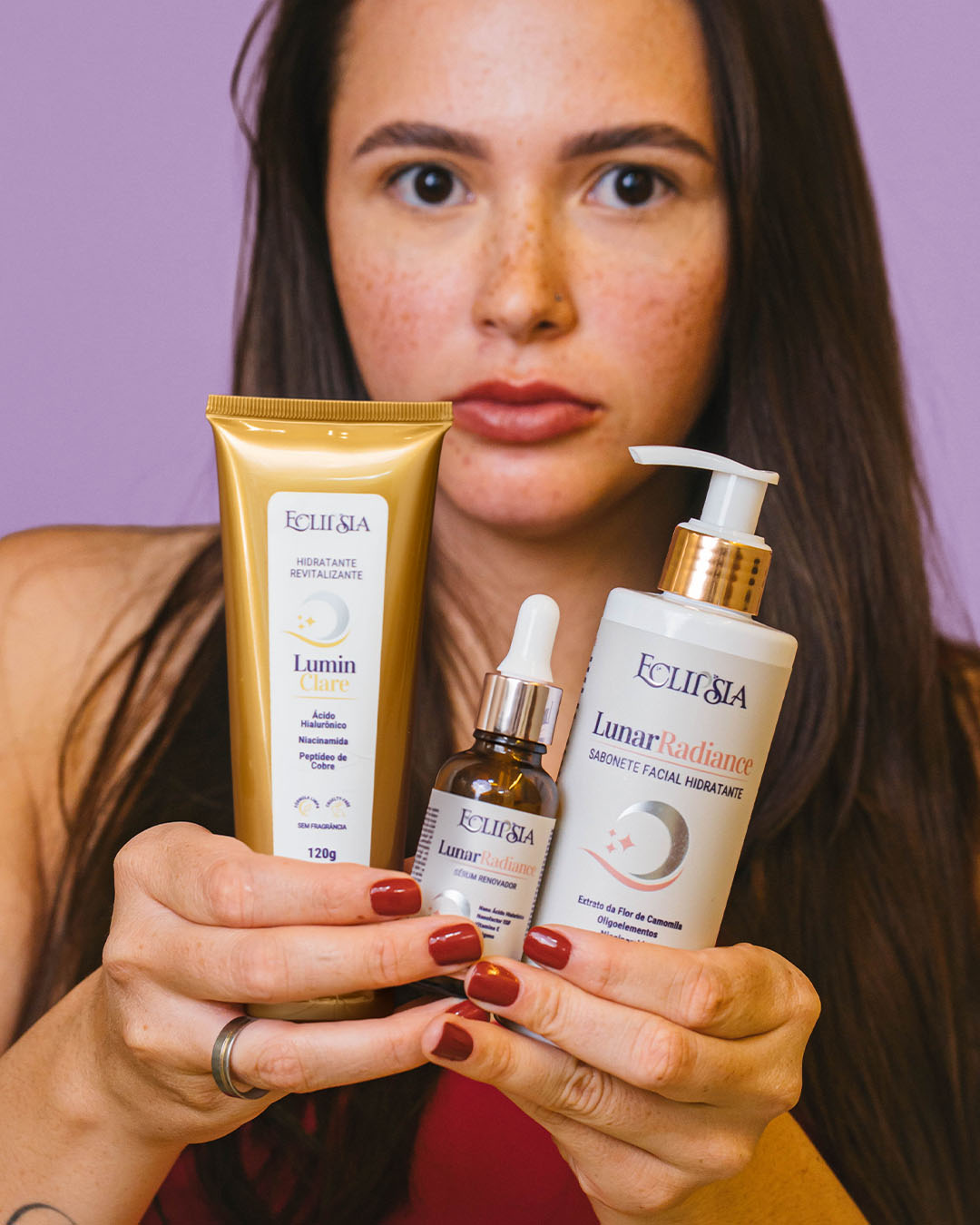 O ritual se inicia com o Sabonete Hidratante Lunar Radiance, que remove impurezas com suavidade, preserva o manto hidrolipídico e prepara a pele para receber os ativos com máxima eficiência.