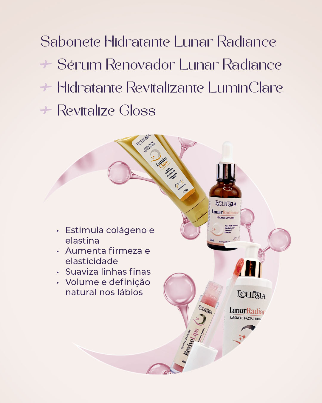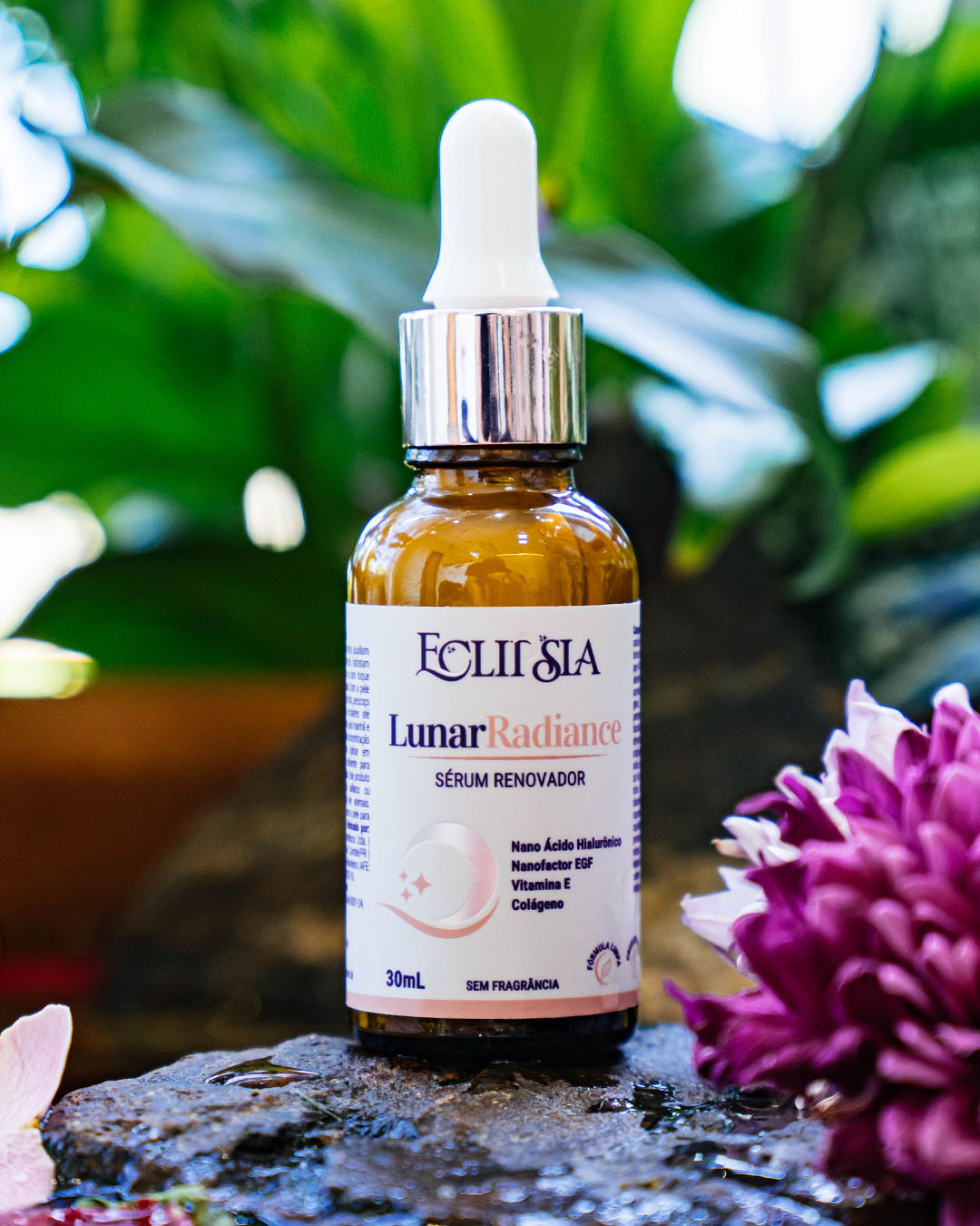 O Sérum Renovador Lunar Radiance combina Silício Orgânico, Colágeno Hidrolisado, Ácido Hialurônico e Fatores de Crescimento, estimulando a síntese de colágeno e elastina, preenchendo microlinhas e melhorando a densidade cutânea.