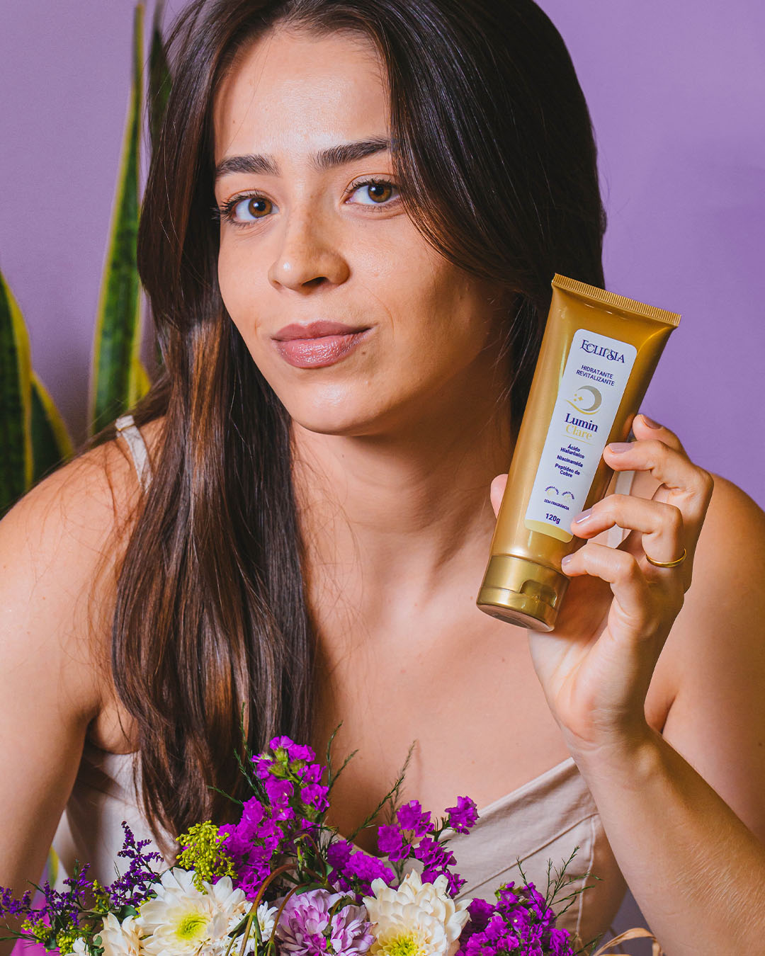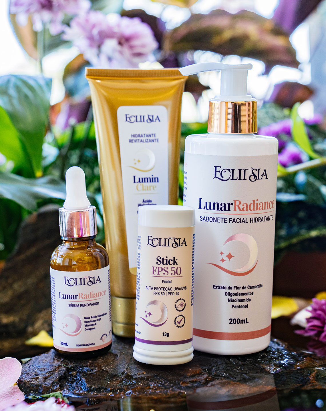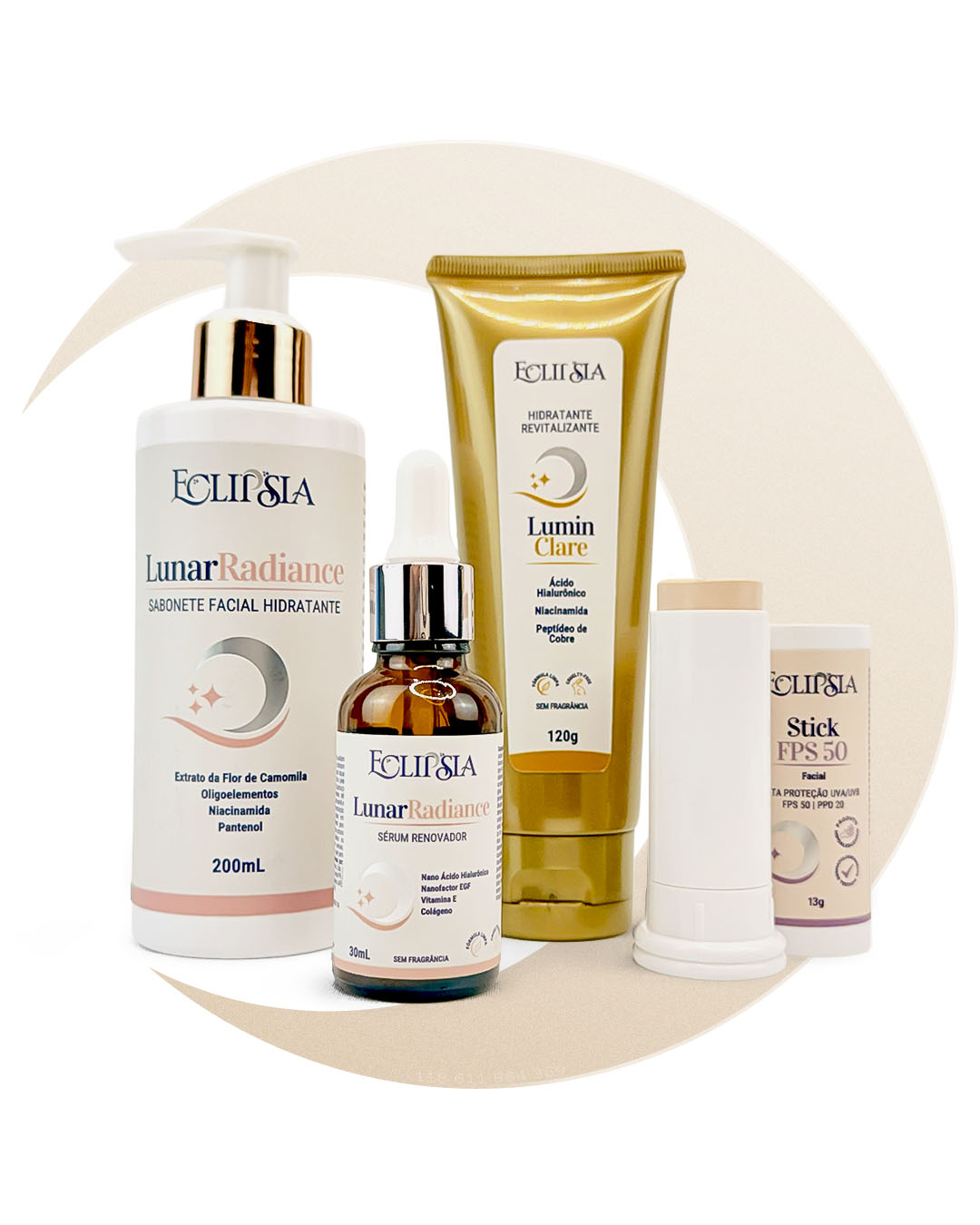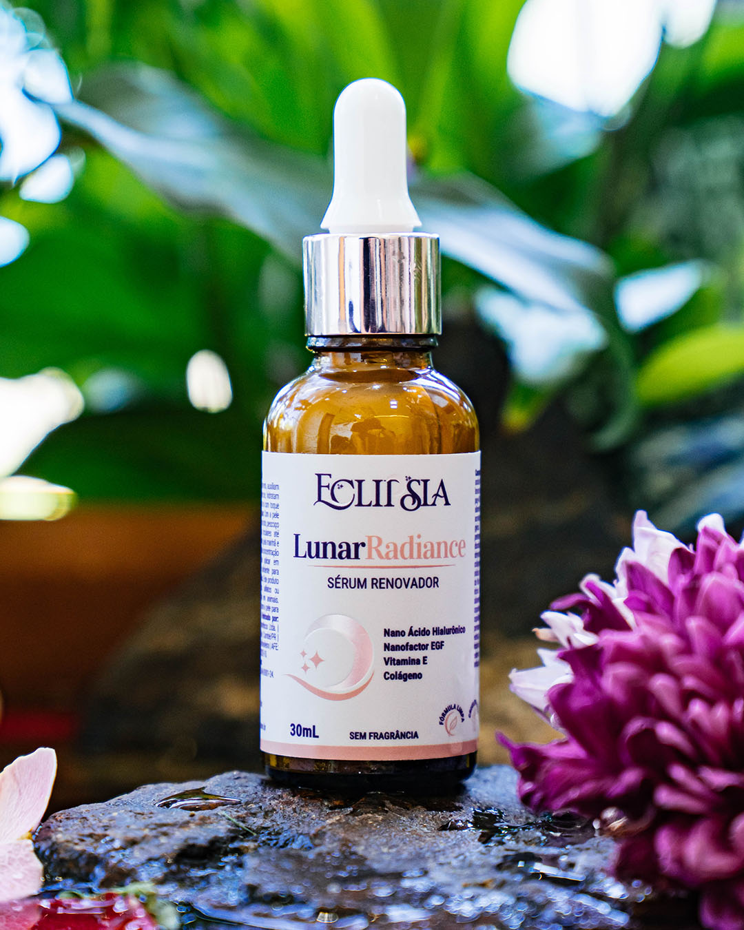 O Sérum Renovador Lunar Radiance estimula colágeno e elastina, melhora textura, preenche microlinhas e acelera regeneração através de Colágeno Hidrolisado, Ácido Hialurônico, Silício Orgânico e Vitamina E.