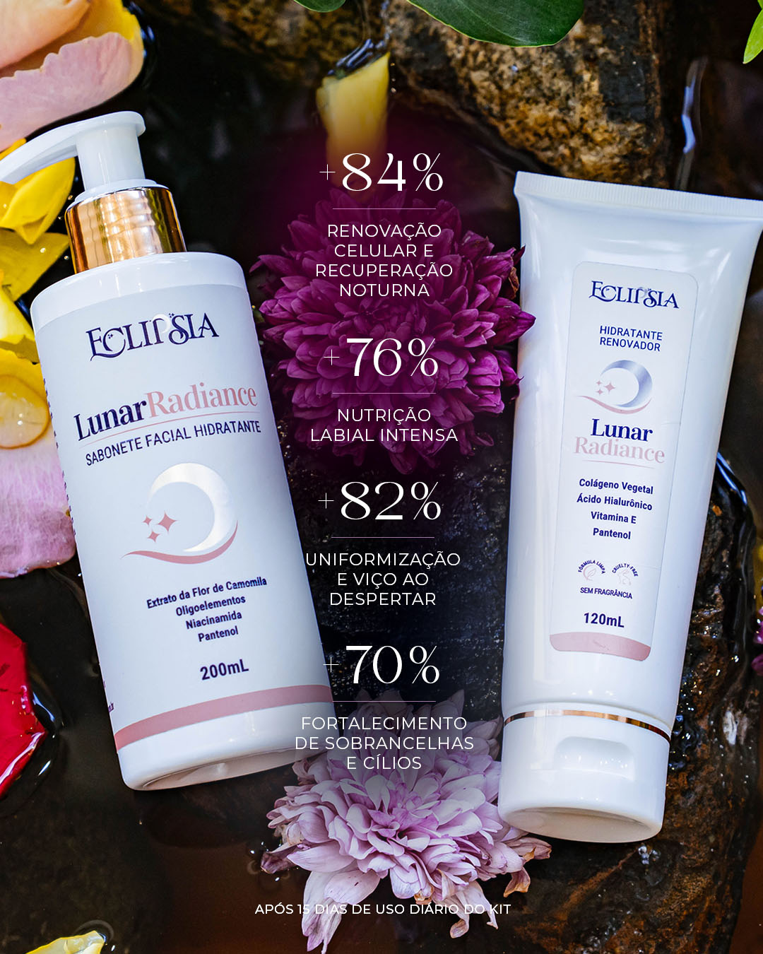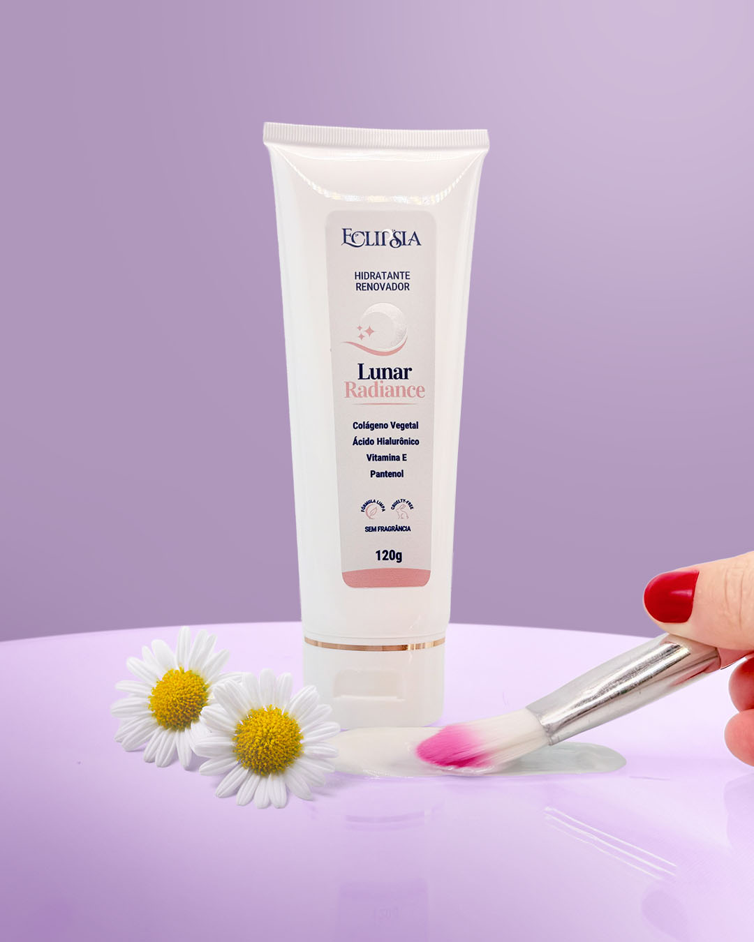 O Hidratante Renovador Lunar Radiance complementa a rotina estimulando colágeno e renovação com Colágeno Hidrolisado, Ácido Hialurônico e Silício Orgânico, fortalecendo a elasticidade e deixando a pele mais estável ao amanhecer.