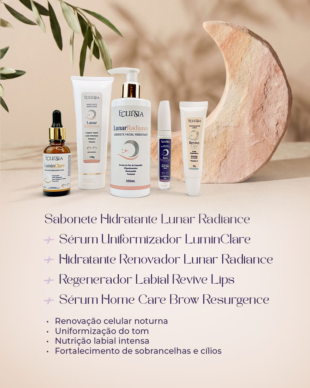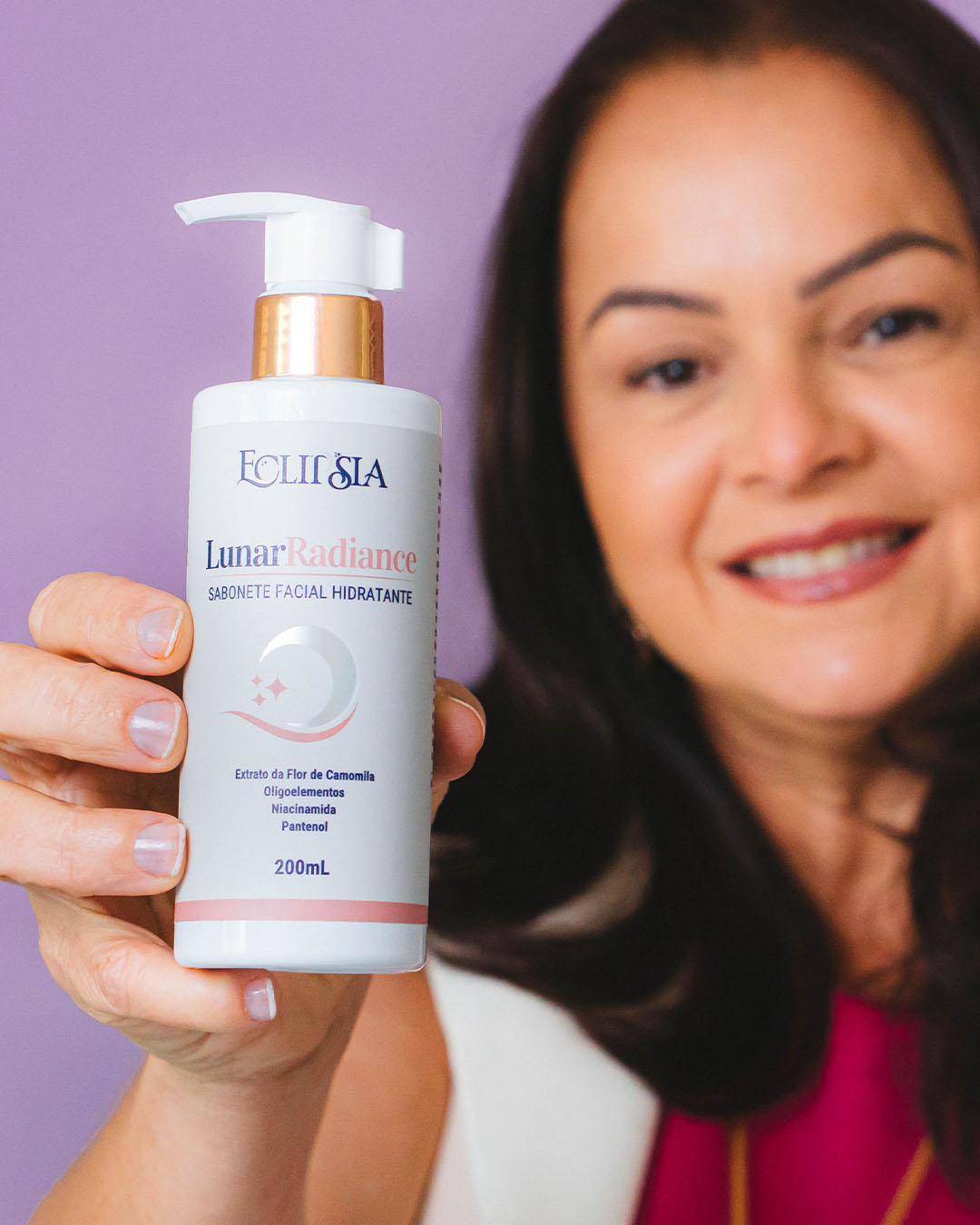 O ritual começa com o Sabonete Hidratante Lunar Radiance, que remove impurezas sem agredir a barreira cutânea, mantendo o manto hidrolipídico preservado e preparando a pele para receber os ativos.