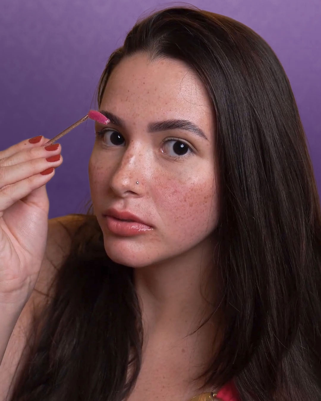 Com as sobrancelhas limpas e secas, aplique uma pequena quantidade da pasta com uma escovinha. Evite excesso, para não comprometer o acabamento natural.