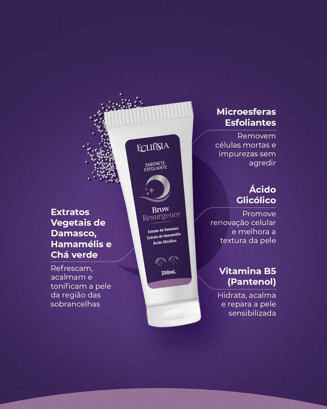 O Sabonete Esfoliante Brow Resurgence foi desenvolvido para uma limpeza renovadora e equilibrada, indicada tanto para a região das sobrancelhas quanto para uso facial.