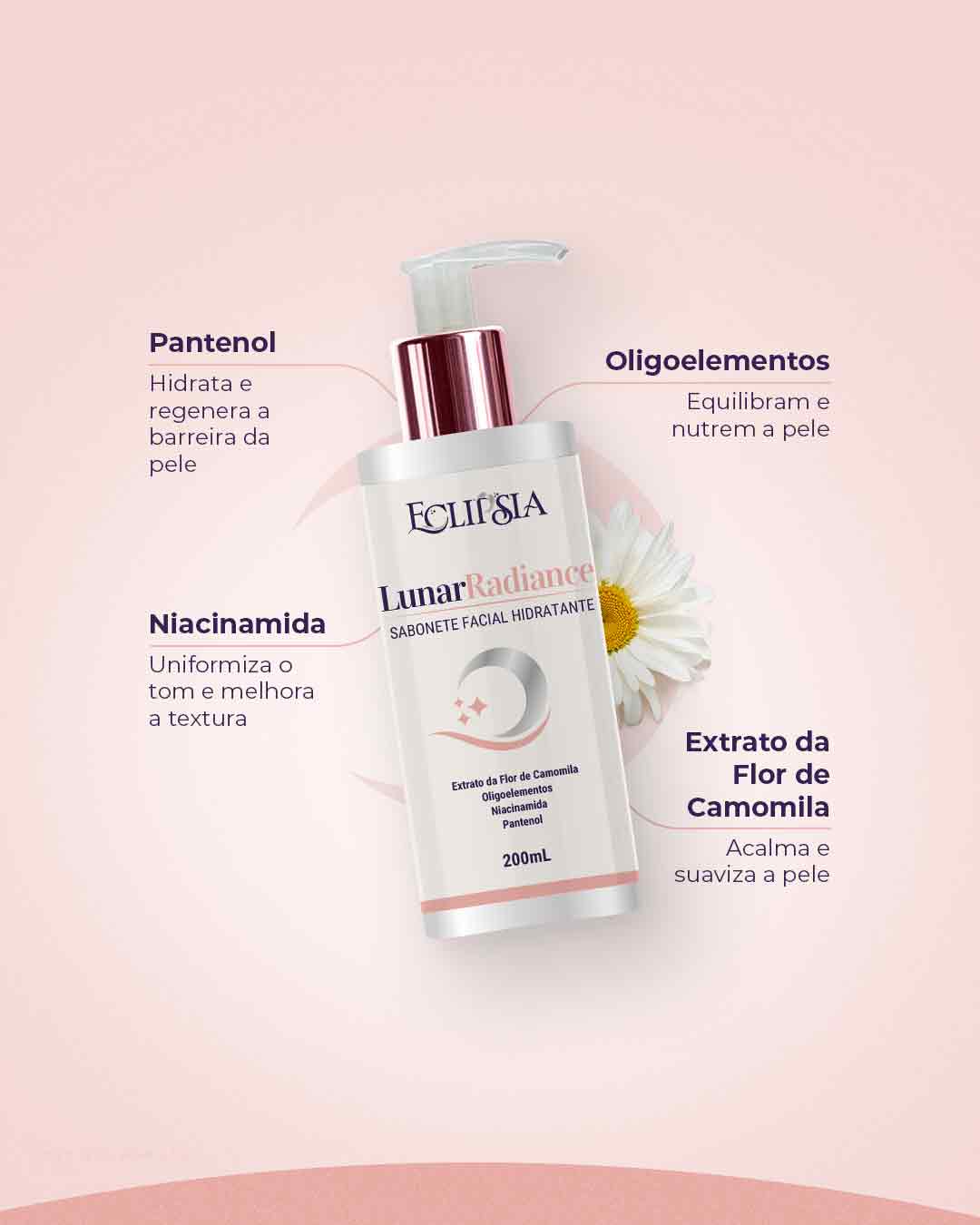 O Sabonete Hidratante Lunar Radiance foi desenvolvido para promover uma limpeza eficiente e delicada, preservando a integridade e a hidratação da pele.