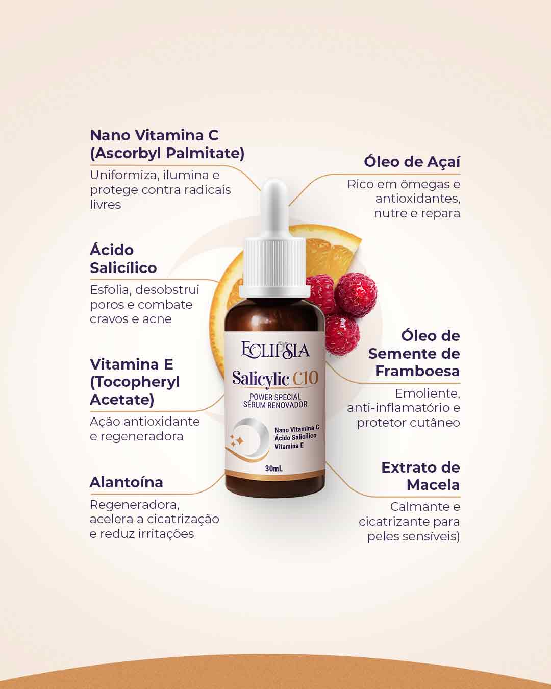 O Sérum Salicylic C10 é um tratamento diário para controle da oleosidade, cravos e textura irregular.